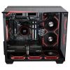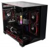 Black gaming computer on a desk with a red background